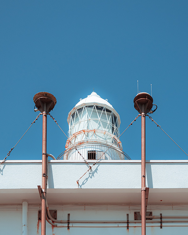 「青空と白い灯台だけだとよく見る写真だなと思い、何かないかと灯台の周りを歩いてみると、2本のパイプの間にちょうど灯台がくる構図を見つけました。左右のパイプと中央の灯台を含め全体が左右対称となるように撮影しています。白い建物と灯台、銅色のパイプ、そして空の青という組み合わせが可愛いと思いました」。