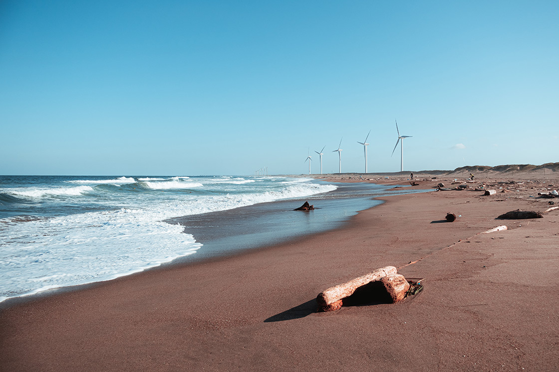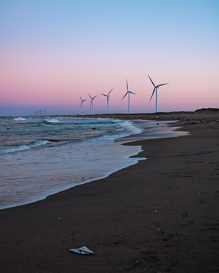 「海岸沿いに並ぶ風車と、空の色を反射して青く染まった海に惹かれて撮影しました。最初は風車と海の波だけに意識を向けていましたが、そうするとフレームの右下が空いてしまって。たまたま見つけた流木を入れることでバランスをとりました。撮影中、楽しくなって油断していたら波に膝下までのまれました(笑)。見たままの美しさをそのまま写し出すだけでなく、そこに自分らしさというものを上乗せした写真を撮れたらと思っています」。