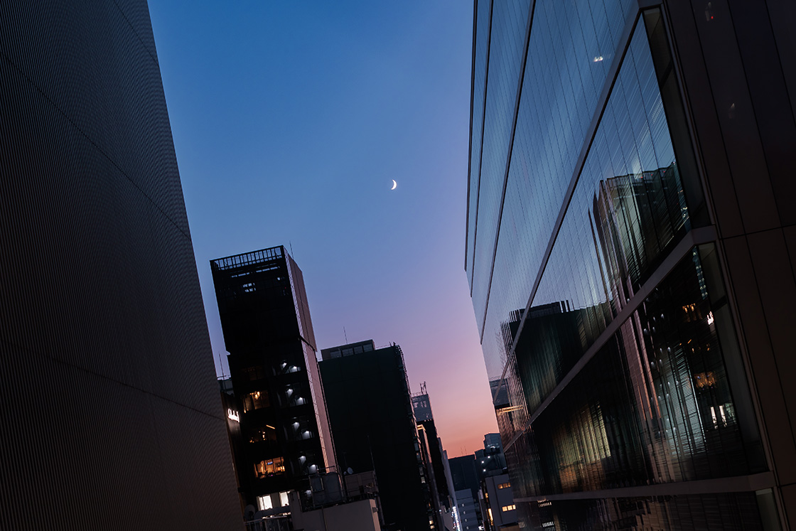 「常日頃から、空の移り変わりや美しい建物に、強く心惹かれています。この日も、ビルの隙間から見えるグラデーションが美しい薄明の空と三日月のコラボレーションを、撮らずにはいられませんでした。三日月を建物の隙間に配置したいと思い、ビルとビルをつなぐ空中回廊に移動して撮影場所を探していたのですが、青く染まった右側のビルがきれいなここで撮ることに決定。構図が引き締まるよう左側の建物も入れて仕上げました」。