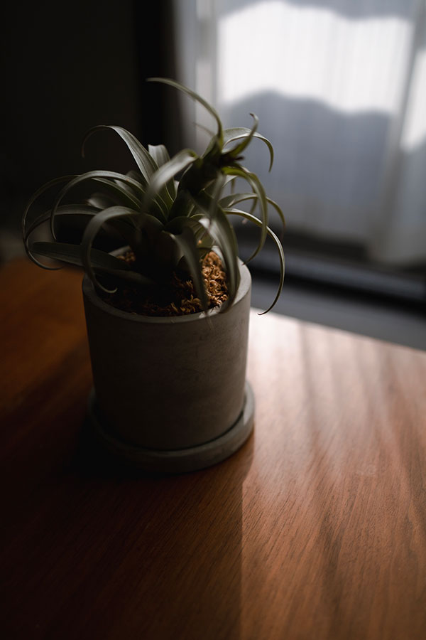 窓から差し込む朝日をうまく使って光が当たる部分と影になる部分がはっきりとする位置に鉢を配置、葉の一部が光を受け、そのシルエットが際立つように撮影しました。キットレンズにもなっているRF35mm F1.8 MACRO IS STMは絞り開放(F1.8)で撮影すると、ピントピークのシャープさと、滑らかなボケがとても美しいです。