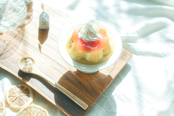 次の写真は午前中10~11時に撮った写真です。少し斜め上くらいからの光が当たるように撮影しました。背景には少しクリーム色に近い布を使い、食べ物だけではなく、ドライフラワー・フルーツなどを画角の中にいれて、全体的に優しい雰囲気が出るようにしています。