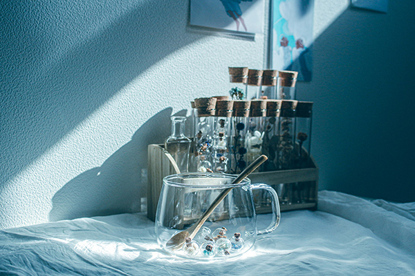 人工光では、卓上の明かりを使用しています。白色に近い明かりで被写体を照らしているだけなので、その影が印象的に映し出され、少し落ち着いた雰囲気になります。