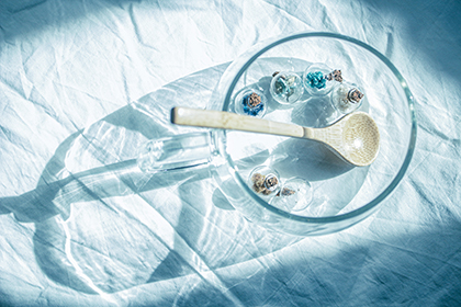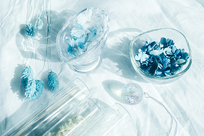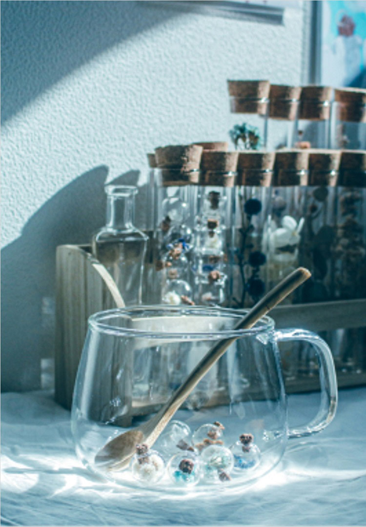 四季ごとに咲く花や夕暮れ後の淡い空や月など、日常の ”好き” をデジタルで写真に収めています。テーブルフォトでは主に硝子やドライフラワーを使い、光と影の組み合わせを撮り集めるのが好きです。