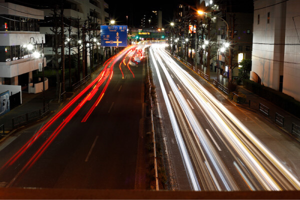 ④ シャッターボタンを押すそうするとシャッタースピードで設定した時間の間に動いた車のランプの光が軌跡となって写真に写すことができるのです。