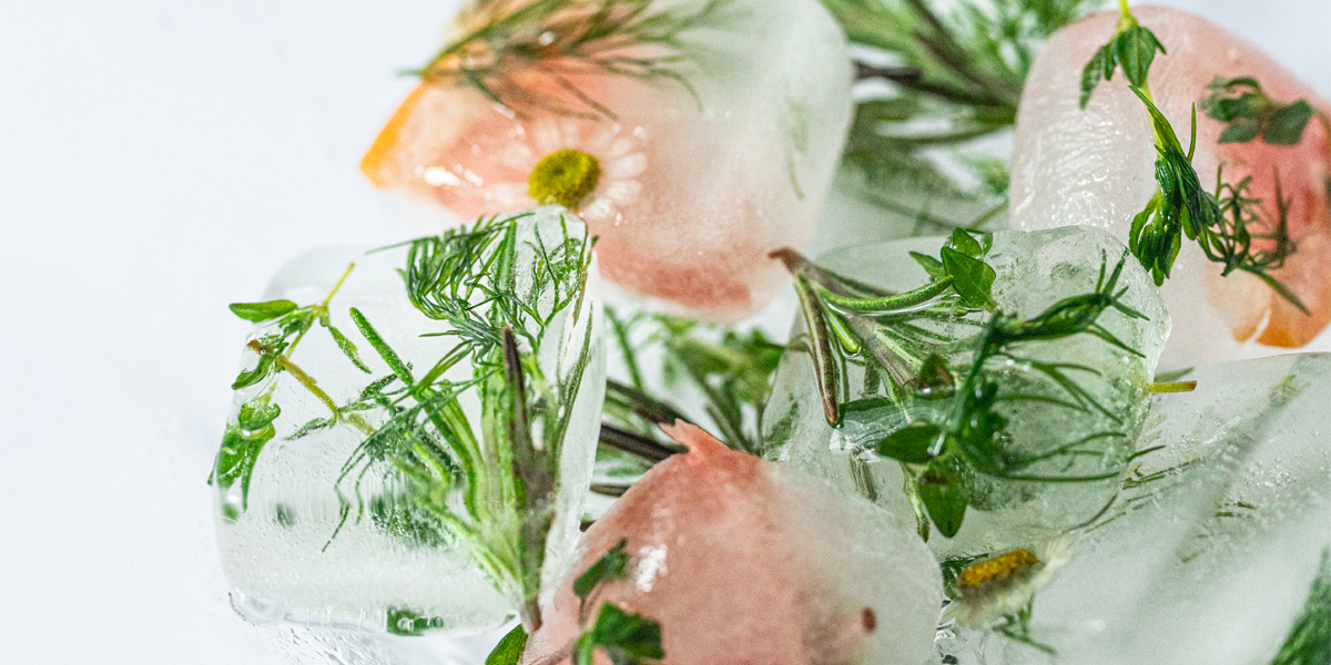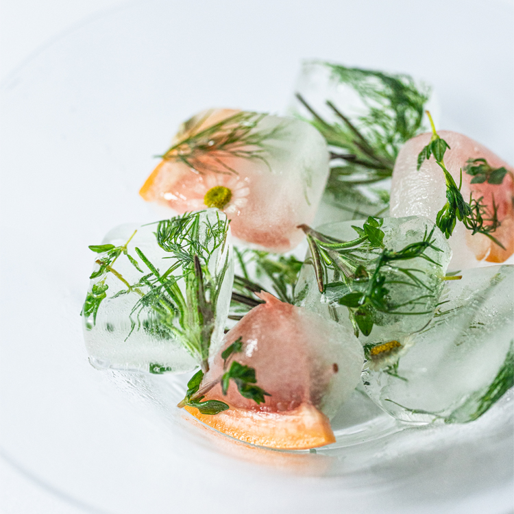 "霜のついた氷や閉じ込められたハーブ、エディブルフラワーの質感や色味も、繊細かつ立体的に描写してくれます。