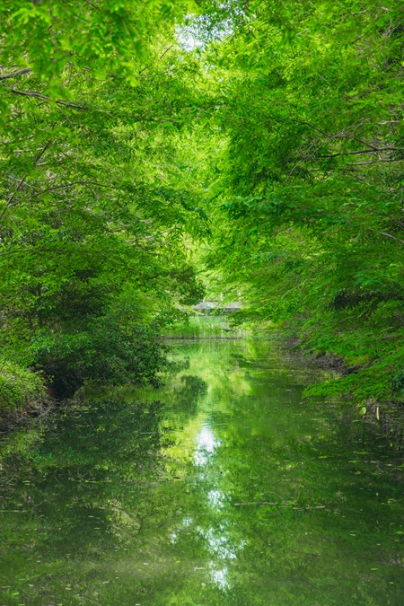 この写真(下)のように両側を緑で囲まれている景色もなかなか都会では見れない光景ですよね。こういう写真を見ていると、風で木の葉が揺れている音や川が流れている音が聞こえてくるようで、それがいいなって思ったんです。
