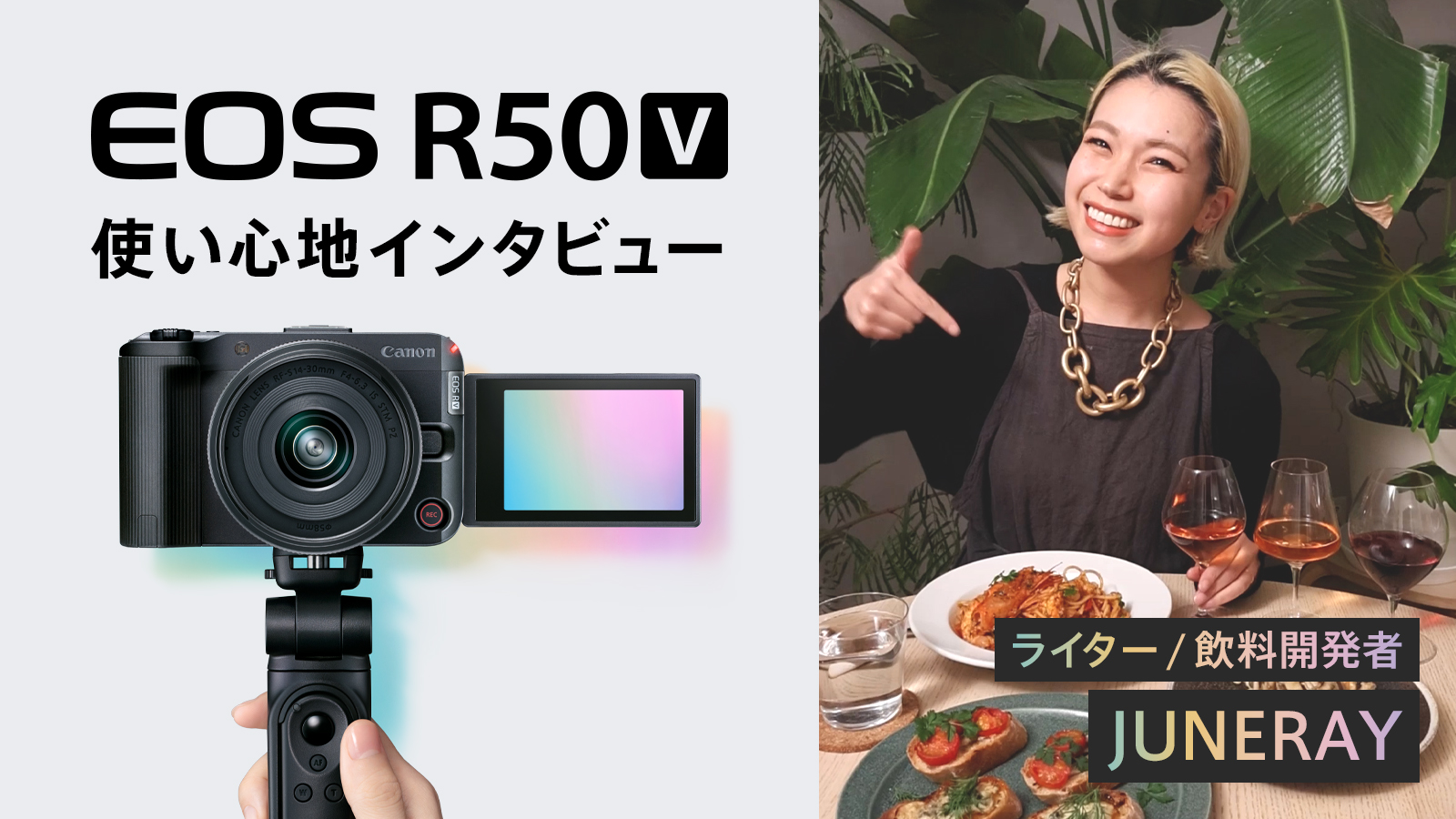 幅広いメディアで活動中のライター/飲料開発者・JUNERAYさんに、動画撮影を追求したデザインに、豊富な機能を搭載したミラーレスカメラEOS R50 Vの使い心地をインタビューしました。EOS R50 Vで撮り下ろした動画も併せてお楽しみください。