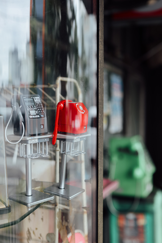 今回僕が撮影したなかでもとくに気に入っているのが、ミニチュアの公衆電話が飾られたガラスケースの奥に、本物の公衆電話が設置されている写真。ガラス越しにハッキリと写ったミニチュアが、ほどよくボケた本物との対比を生み出していて、なかなかおもしろい一枚になったと思います。