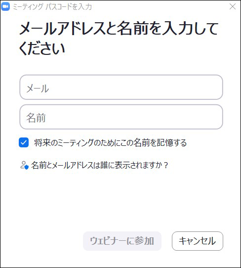 「メールアドレス」と「名前」を入力して、「ウェビナーに参加」をクリックします。