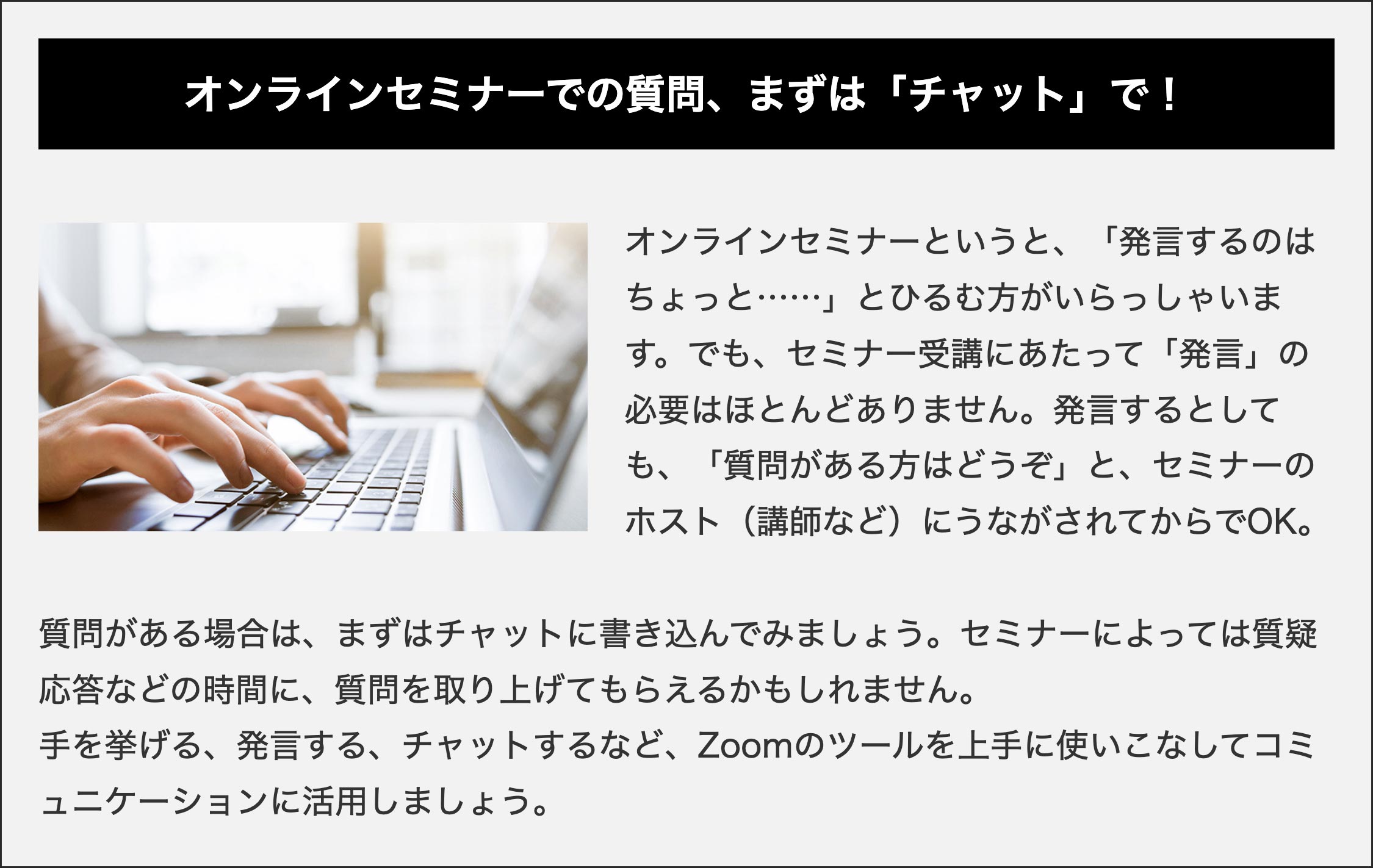 セミナー中のやりとり(質問、感想など)は基本的にチャットで行います。ぜひ覚えておきましょう。