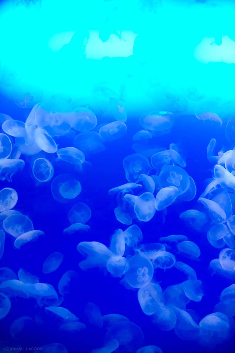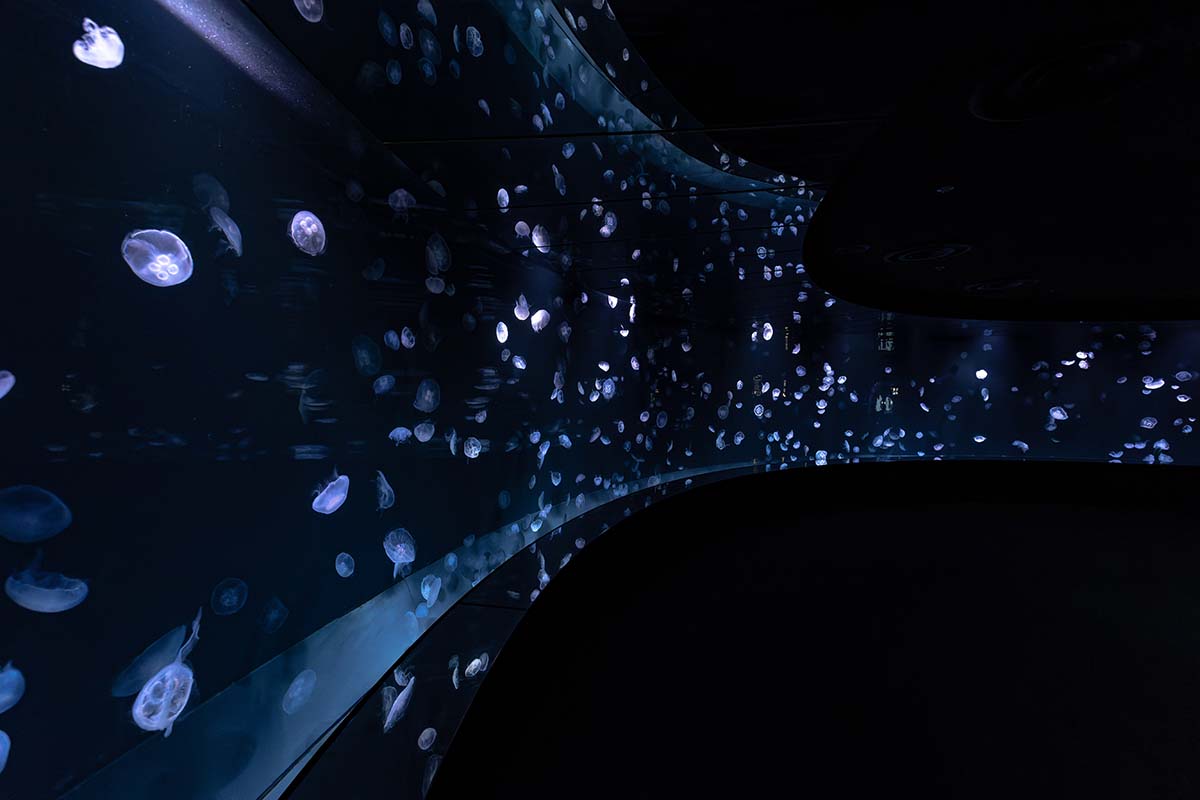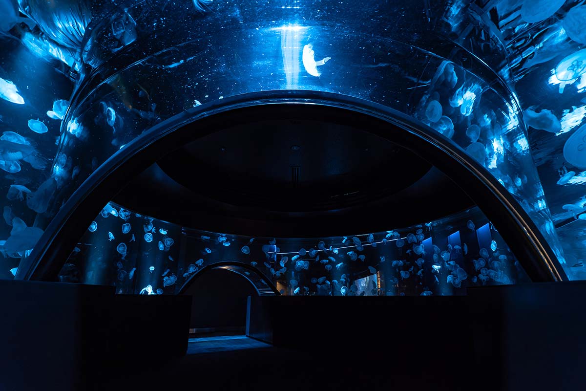 まず、サンシャイン水族館(東京都)について。ここのクラゲの水槽は幅約14メートルの大パノラマ水槽! 国内最大級となる横幅で、ここでは暗い海の中で、無数のミズクラゲに包まれるような没入感と浮遊感が感じられます。