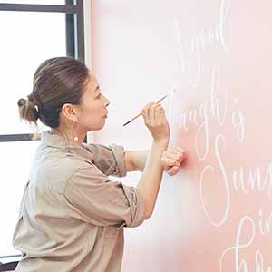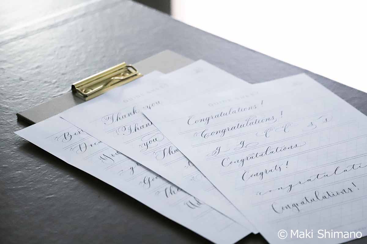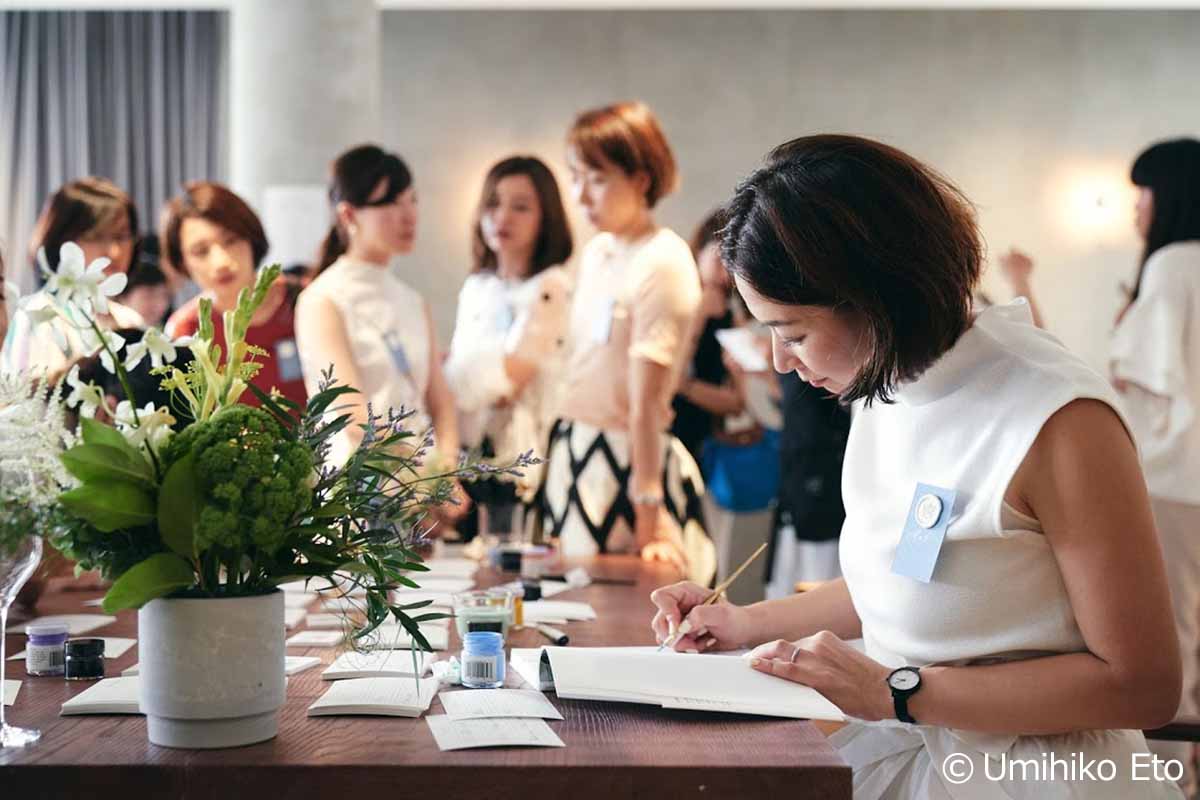 モダンカリグラフィーの魅力をウエディングきっかけで伝え始めて7年以上の月日が経ち、ウエディングの世界だけでなく子どものパーティー、グリーティングカード、手帳、様々なプロダクト製作など活動がかなり広くなった。そして「わたしも書けるようになりたいので教えてほしいです!」というお声かけから始まったレッスンは2016年の立ち上げ以来、今もなお月に100名以上の方が習いに来てくださる。