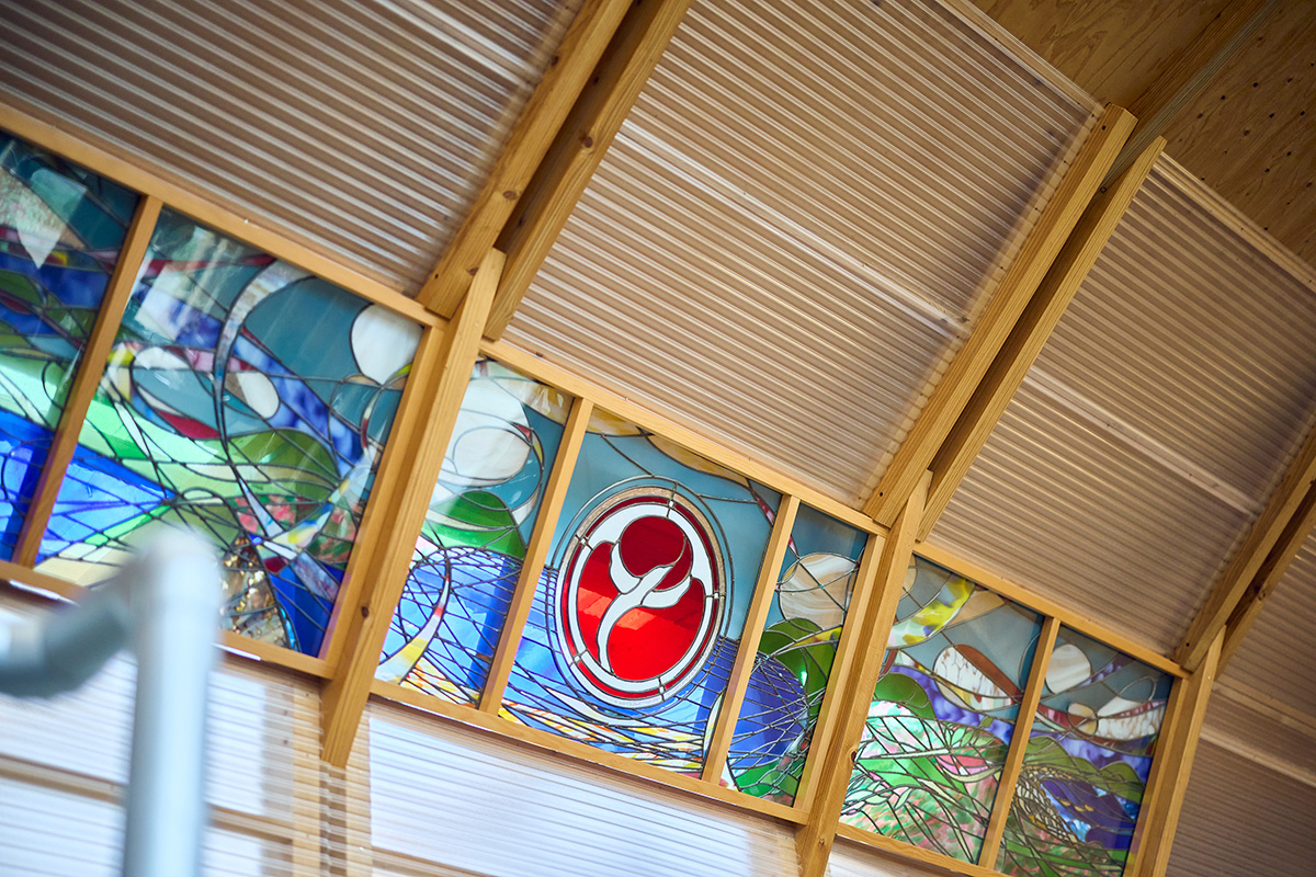 五島つばき蒸溜所の天井部分にある美しいステンドグラスは、島内にステンドグラス工房を構える作家が制作したもの。椿の種子をあしらった蒸溜所のシンボルマークが中央に、その周辺を包み込むように五島の美しい海やビーチ、空や風、山の風景が象徴的にデザインされています。