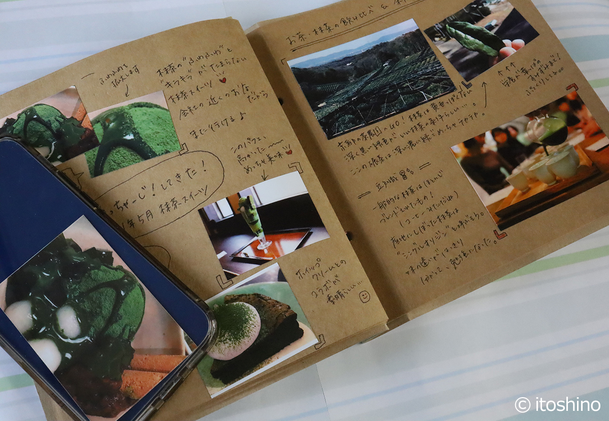 抹茶の写真をステッカーにしていつでも見えるところに貼ったり、抹茶好きとつながるきっかけになるかも。行った場所を手帳にまとめるのもおすすめ!