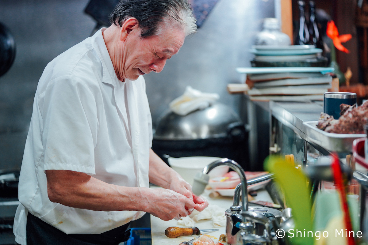 福島弁で笑うと目がなくなってしまうおじさん。カウンターには常連のおじさんの横顔。奥の鍋には茶碗蒸しがあって、おじさんの背中には何十年も使ってきた食器たちが並び、手前ではお母さんが洗い物をしています。魚を取ってくる漁師、市場で魚を仕入れる人、それを調理する人、食べる人。書けば当たり前に思うこの「魚の流れ」も、目を凝らして見ればそこには必ず「人」がいて、目利きと手仕事で成り立っていることがわかります。これは一次産業者が多く働いている街だからこそわかることで、僕は写真を撮って、地元の人に話しを訊くまではイマイチわかっていませんでした。
