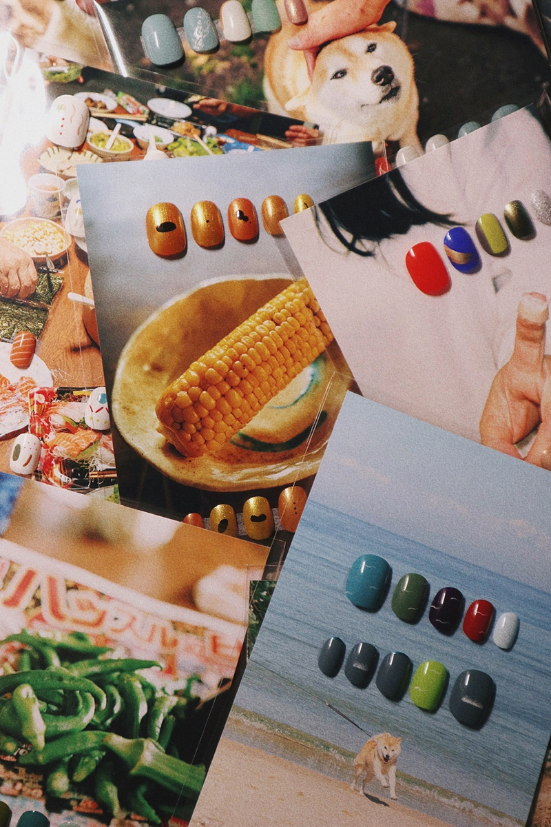 「つけ爪らしくないつけ爪を作りたい」と普段から思っているので、台紙にする写真もネイルらしいものというよりは、生活を感じられる写真や、季節感のある写真、食べ物の写真などを選んでいます。また、爪の見せ方においても、それまでは白い背景で写真を撮るだけのワンパターンだったので、昨年カメラを買ったことをきっかけに、背景を変えたり小物を使って撮ったりするようになりました。