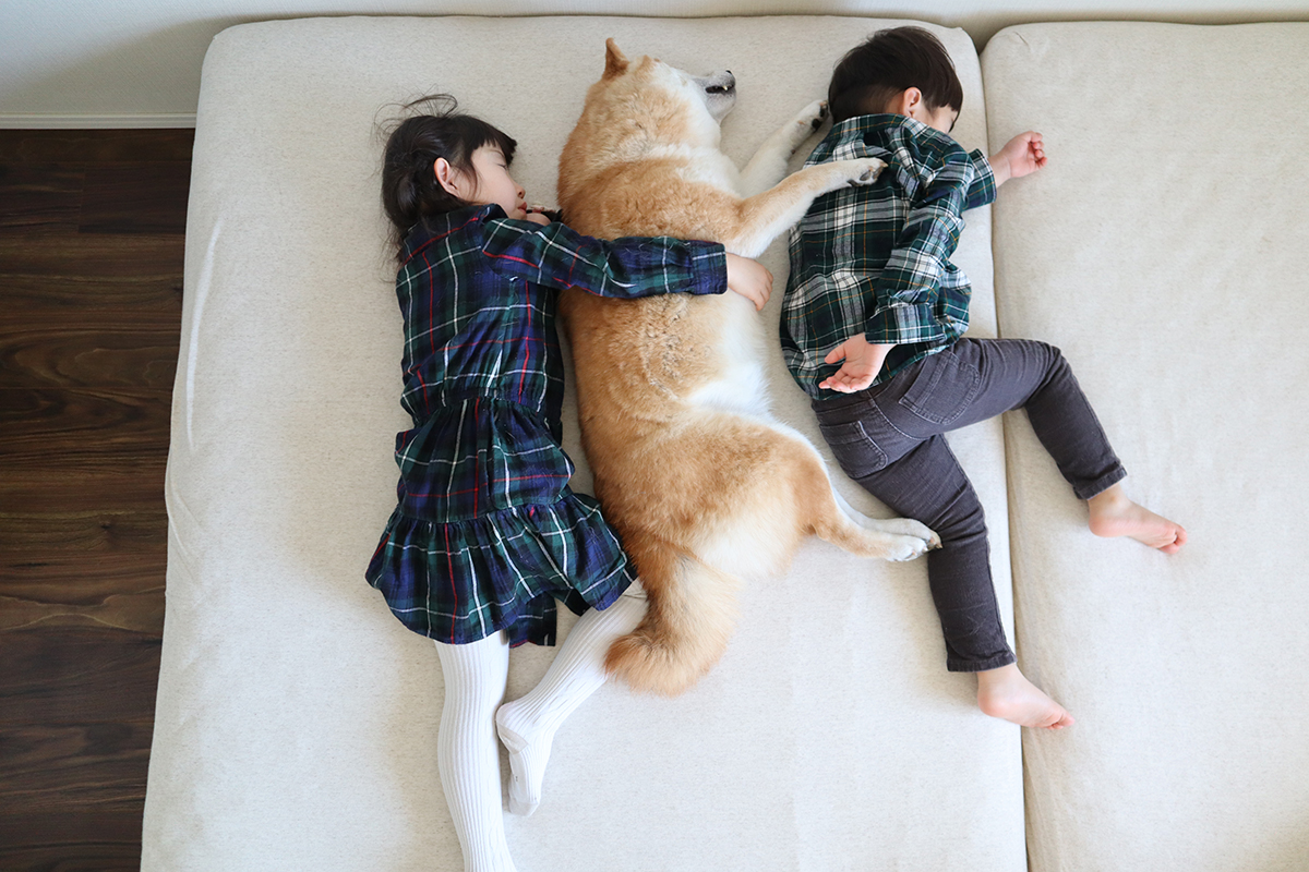 ご飯前、我が家の娘(6歳)と息子(4歳)が手洗いに向かえば当たり前のようにダイニングチェアの上に座ってみんなを待つ。銀次郎のご飯はとっくに終わっているんですけどね。寝る時も、子どもたちと一緒に寝室へ。ベッドでは川の字になって寝ています。犬も人間も関係ない、我が家のなかよし3人(匹?)兄弟の日常の1コマです。