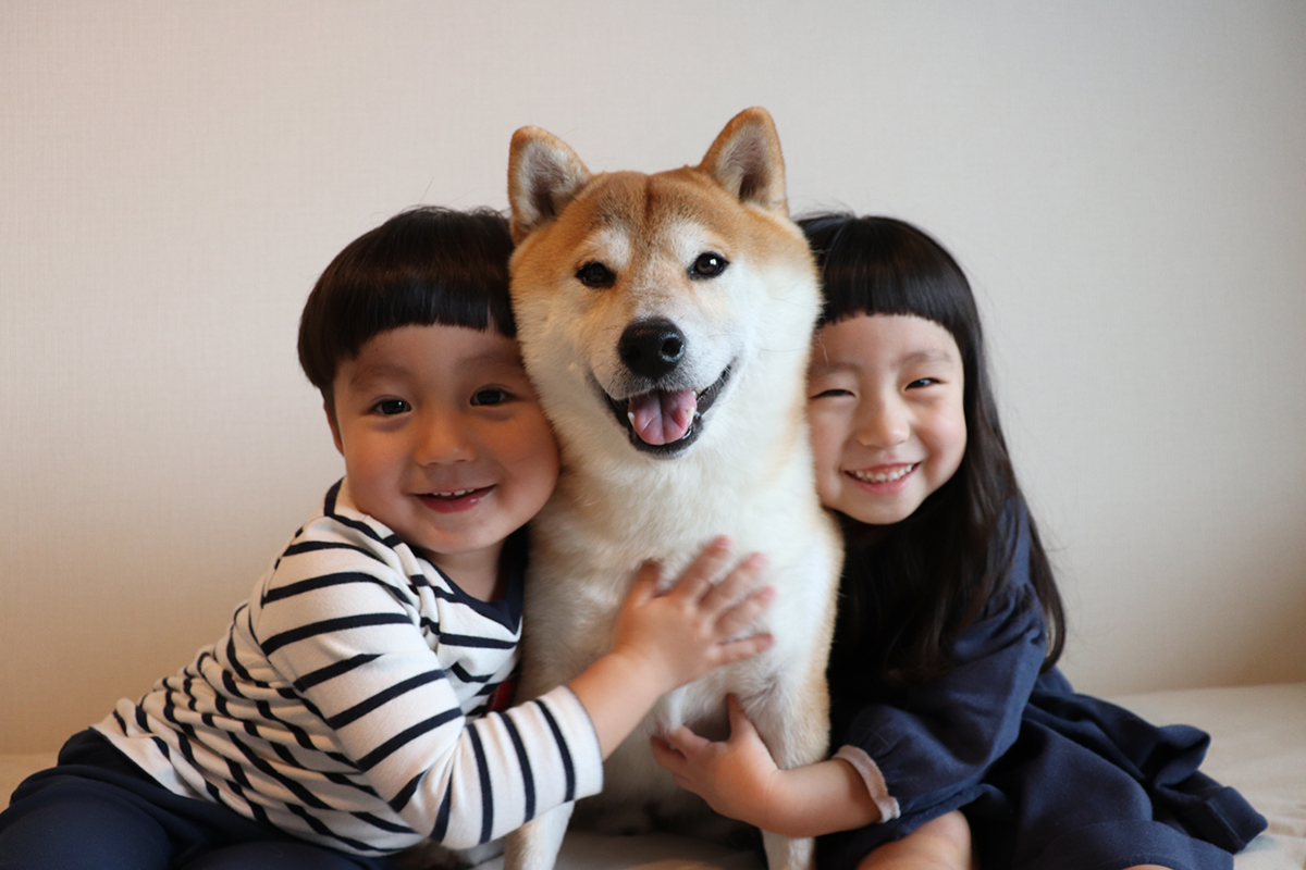 柴犬の銀次郎と、育ち盛りの1女1男がいるファミリー。母・百華さん撮影による、銀次郎と子どもたちのなかよし写真がSNSにて広く支持されている。
