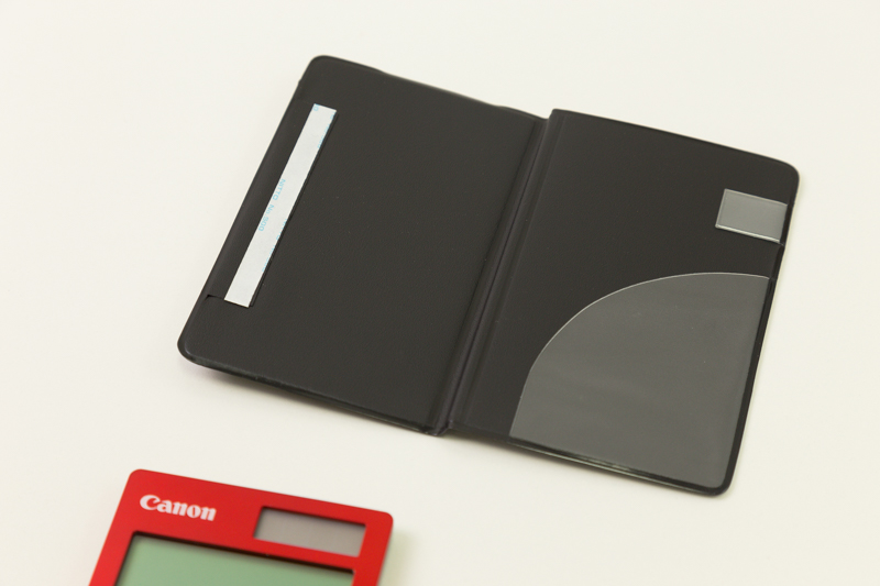 開くと、左側には電卓を固定するテープが、右側にはペンホルダーとミニポケットがあります。ペンや名刺や付箋などを同時に携帯できるようになっています。