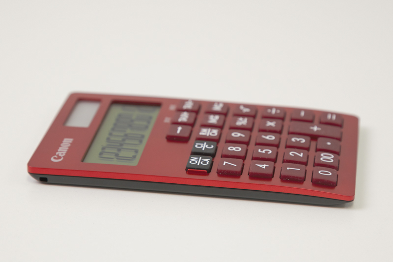 電卓本体の色合いは写真で見るよりも落ち着いた雰囲気に見えます。液晶周りはプラスティック、キー周りは金属っぽい感触です。