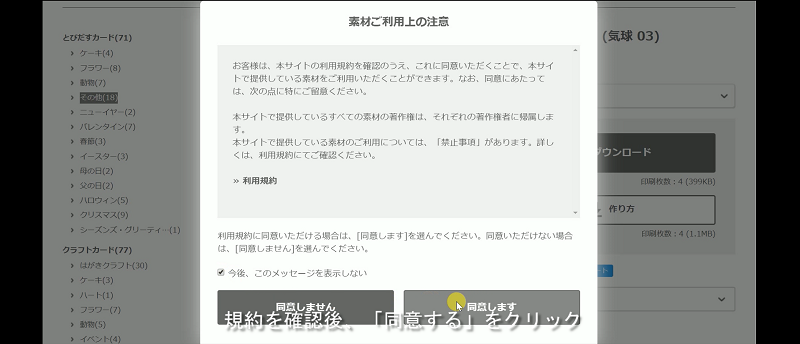 ダウンロードは、まず素材横の「ダウンロード」をクリックします。