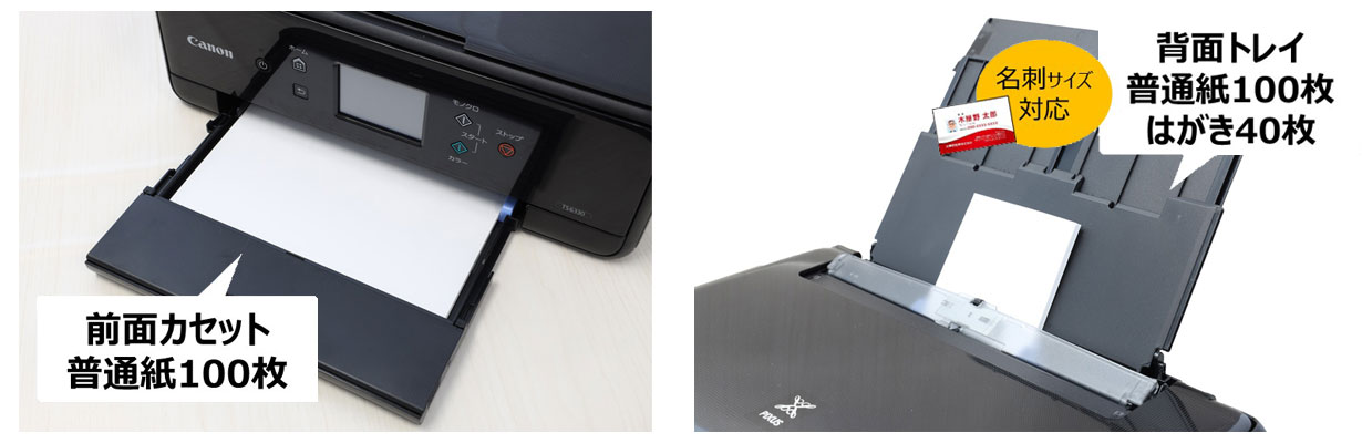 PIXUS TS6330は前面給紙カセット、背面給紙トレイを搭載。前面給紙カセットには普通紙や封筒など、背面給紙トレイには写真用紙やハガキなどをセットできます。普通紙を前面給紙カセットへ常時入れておけるので、写真プリント時の用紙交換の手間が省けます。