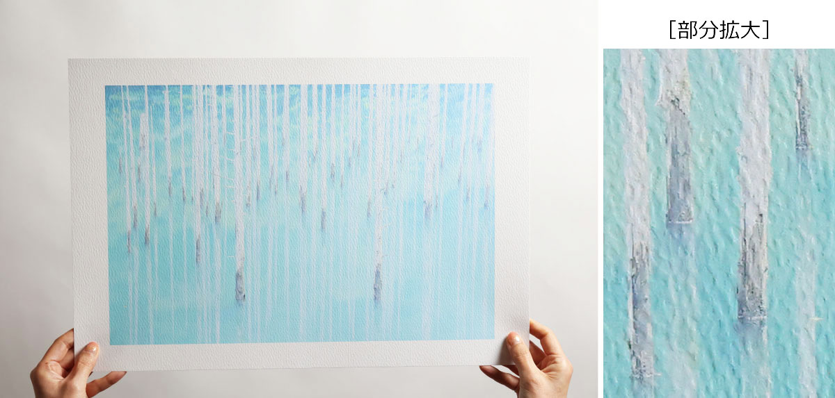また、顔料系インクで問題となりやすいブロンズ現象(作品に映り込む照明光に本来とは違った色味がついて見えてしまう現象)が抑制され、展示場所を選ばない仕上がりにも注目です。高い黒濃度を持つ「新マットブラックインク」により、ぼやけた黒になりがちなマット系用紙でも、引き締まった黒を表現できます。