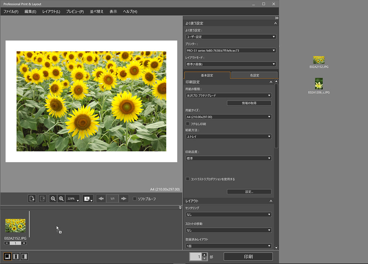 きちんと調整できるモニター環境さえ用意すれば、PRO-G1、PRO-S1対応ソフトの「Professional Print & Layout」を使用し、用紙の種類を選択するだけで、モニター表示と一致するカラーマネジメントによるプリント環境を簡単に構築できます。