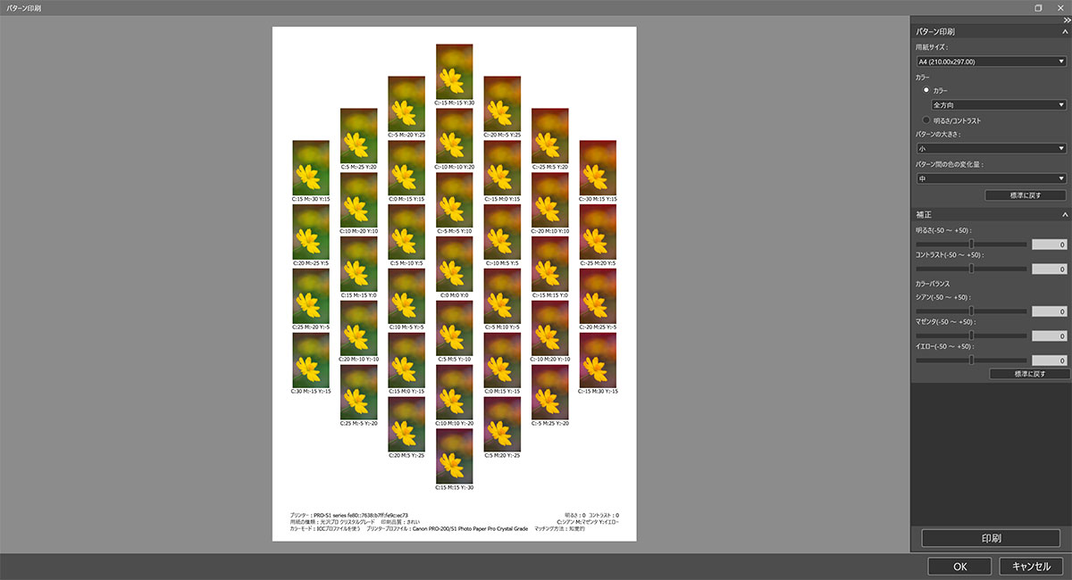 明るさや色合い、コントラストなどの値を少しずつ変化させたサムネイルを印刷可能。サムネイルの下には設定値が印刷されるので、選んだサムネイルの値を入力することで正確な色調整ができます。