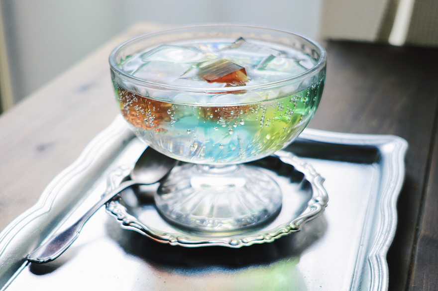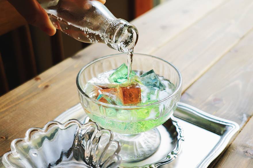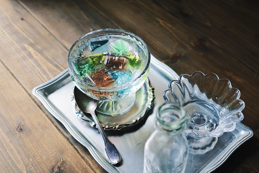 こちらは、ゼリーにぐっと寄った写真です。ゼリーの輪郭ではなく、ソーダの中に広がる色を意識し、レースのカーテンを半分ほど開けて強めの逆光下で撮影しています。そのためゼリーが入ったソーダの表面は照り返しが多くなりますが、一方でトレーにゼリーの色味が反射して、虹のような美しい色が現れてくれます。1つのフードでも、どこにフォーカスするかで表情が変わるのを楽しむことができます。