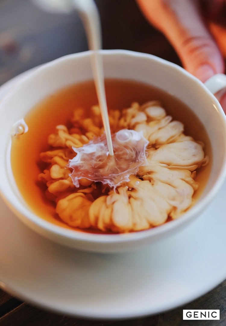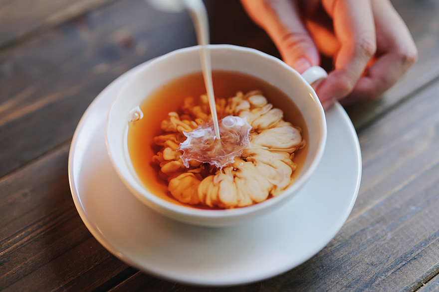 ホットティーの場合は、浅いティーカップを準備すると、注いだミルクが速く底に接触し、反動で表面にもくもくと上昇していく広がりを捉えることができます。ミルクを注ぐ位置の高さやティーカップの形によっても広がり方が違うので、いろいろ試行錯誤してみるのも楽しいと思います。