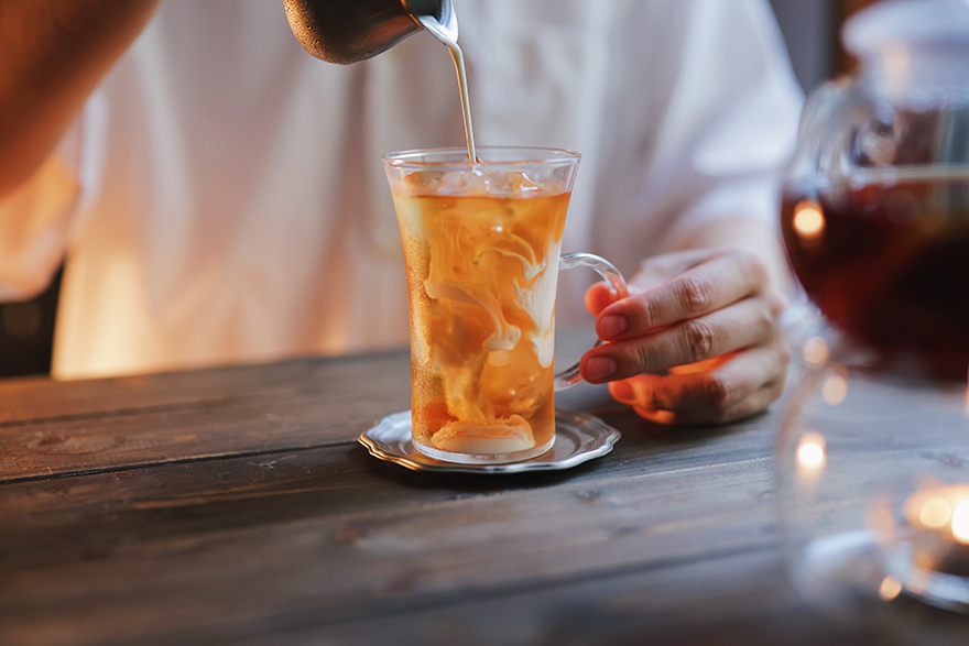 ミルクを注ぐ瞬間は、アイスティーでも応用できます。