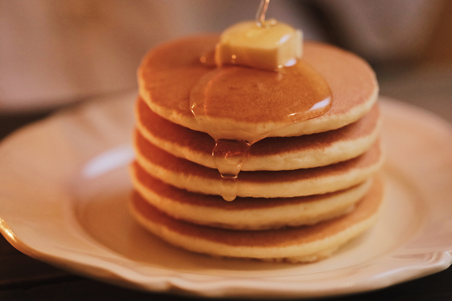 また、はちみつが流れていく先は撮影の準備段階である程度コントロールすることができます。例えば、ホットケーキ1枚でも均一に膨らんでいるわけではないので、ホットケーキをくるくる回転させながら積み方を調整することで、カメラに向かって意図的に傾斜を作ることが可能です。あとはバターにはちみつを当てながら、傾斜に向かうように流し入れます。
