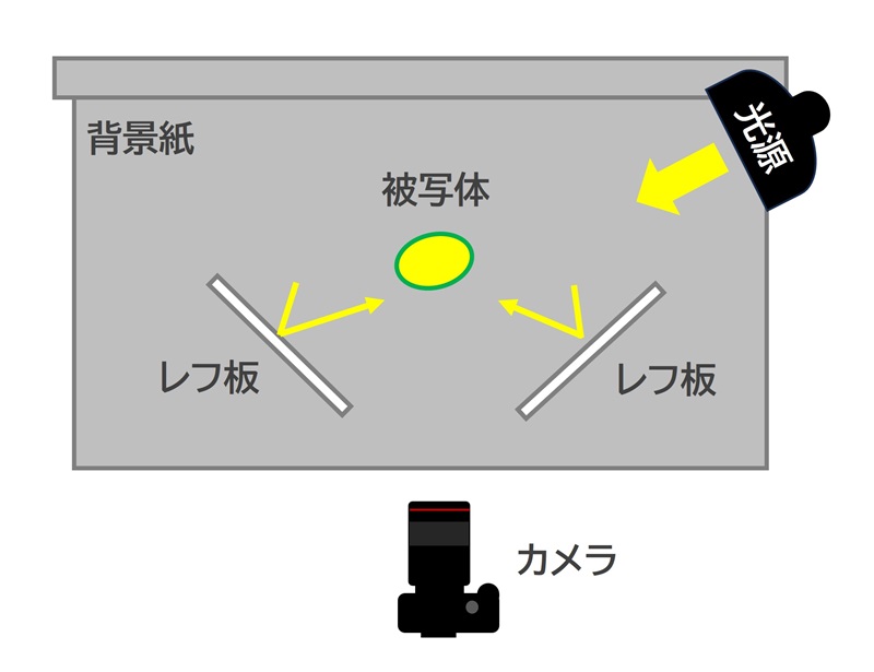 ご自宅では、スタジオのようにたくさんの光源はなかなかありませんが、少ない光源でもレフ板を使うことで、光をコントロールして立体感を出したり、暗い部分を明るくすることができます。左右に置くだけなので、ご自宅でもかんたんに再現できます。
