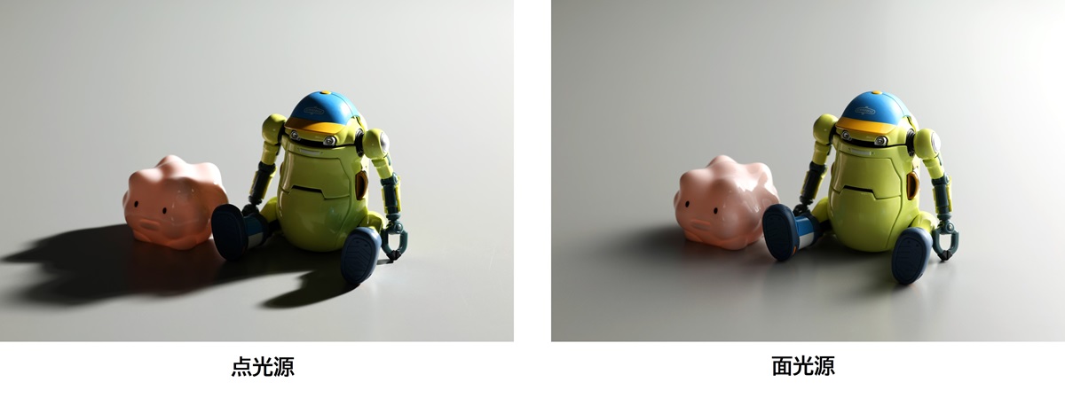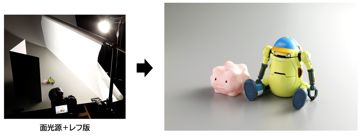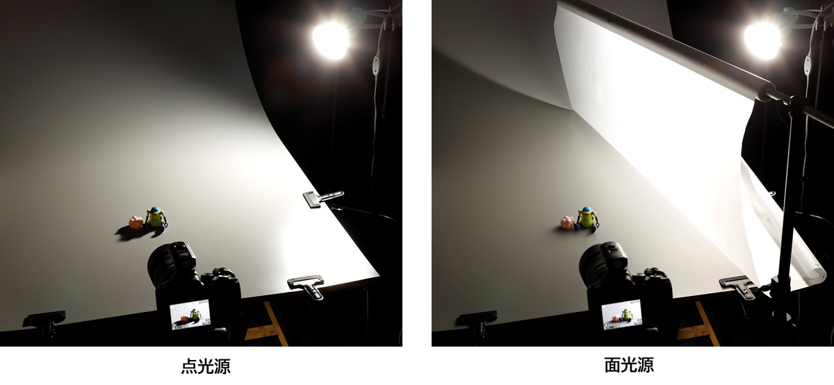 晴れた日に太陽の光が直接当たっているようにはっきり影が出るのが点光源、曇り空で雲を通って光がふんわり当たっているのが面光源のイメージです。撮影したい雰囲気や状況に合わせて使い分けます。