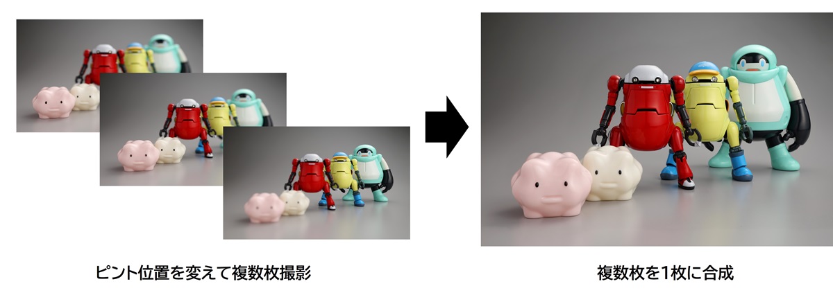 フォーカスブラケットとは、カメラが自動でピントの位置を変えながら複数枚の写真を撮影してくれる機能です。撮った複数枚の写真を1枚の写真に合成することを「深度合成」といいます。