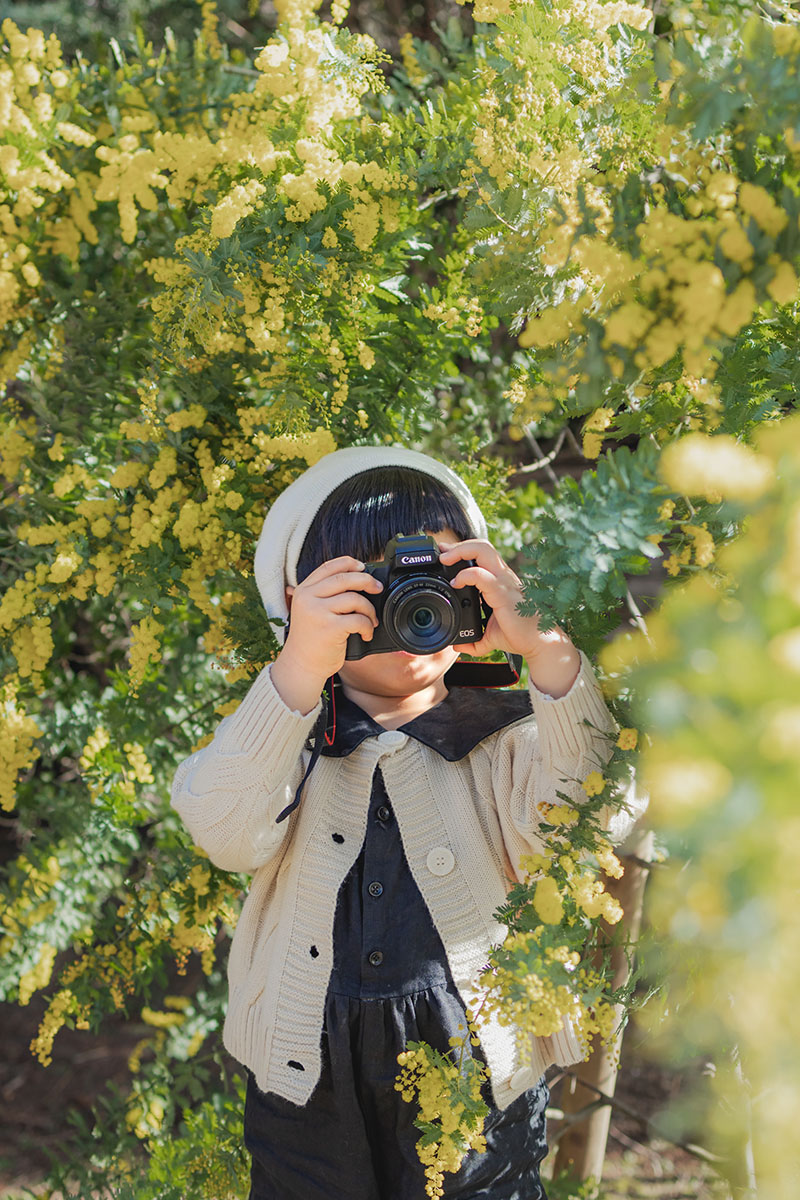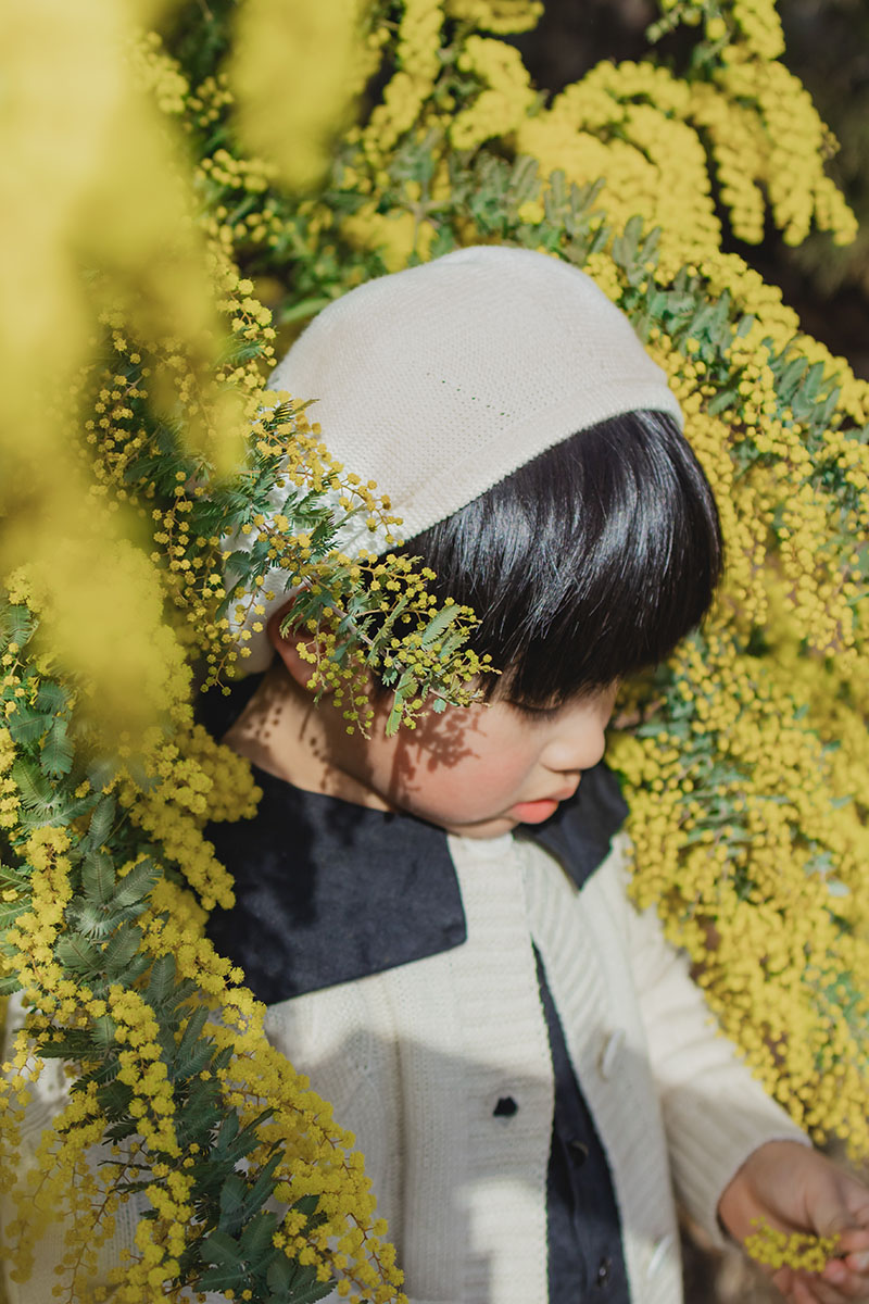 ミモザの小さなもふもふのお花を「これはなんだろう」と不思議そうに優しく触っている様子を捉えたくて、静かに声も掛けず、そのままの自然な姿を収めました。全体的にミモザがもりもりとボリューム感がある角度で、お花に埋もれるような場所で、ボケのグラデーションが綺麗に出るように構図を決めています。さらにポンポンのようなミモザのかわいらしい先端のフォルムを影で表現したく、順光で顔に影が落ちるようなアングルで撮りました。