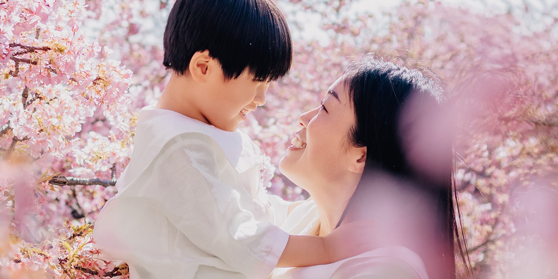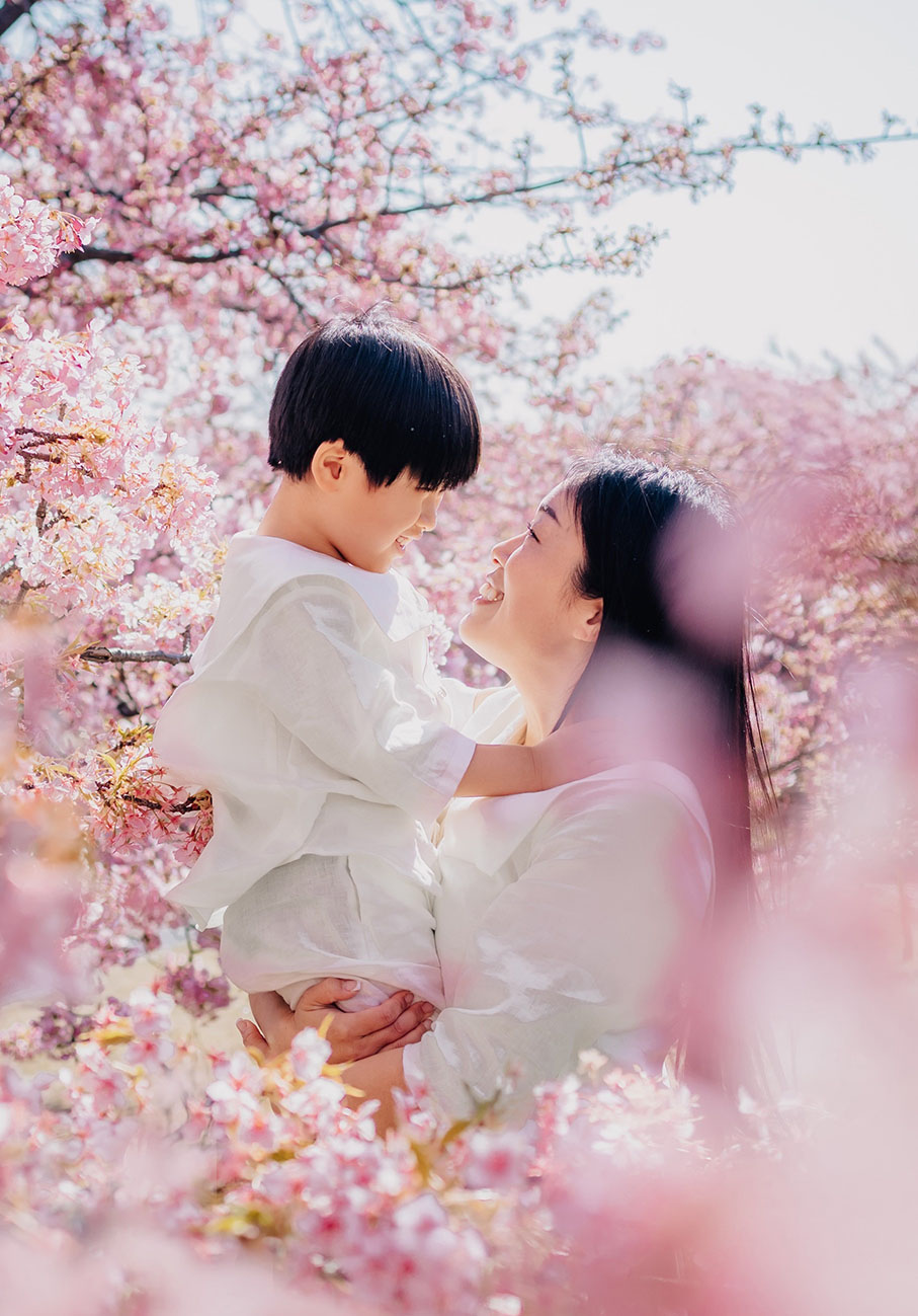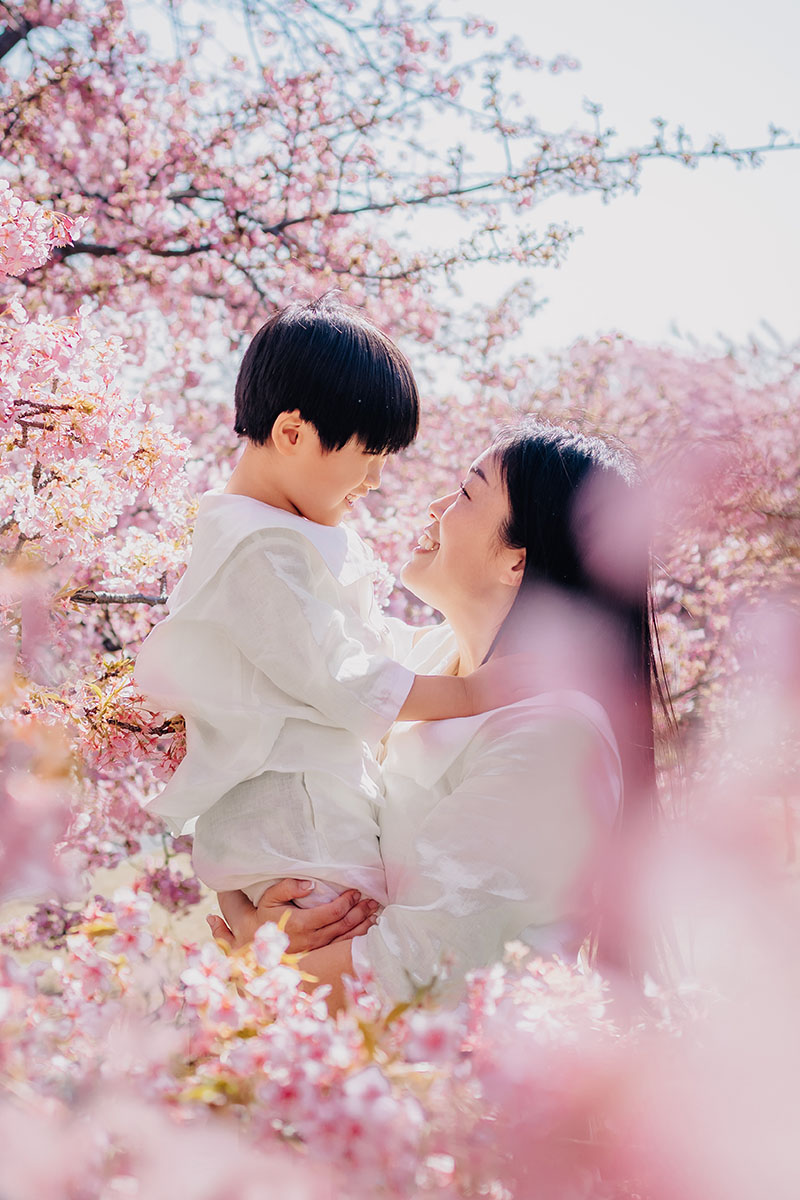 晴れた日の午前中、半逆光で前ボケに光が当たってキラキラする角度で構図を定め、桜の花のディテールもしっかり残せるよう、子どもの顔に近い位置にお花が来るように、枝の隙間に立ってもらいました。子どもの楽しそうな表情をメインで撮りたかったので、しっかりと寄りに。桜のボケ感も捉えたいと思い、ボケのフレームになるように、枝の隙間から撮影しました。どんな話をしていたかも忘れてしまったくらい何でもない話をしつつ、2人で大きな声でゲラゲラ笑いながら撮った、思い出の一枚です。