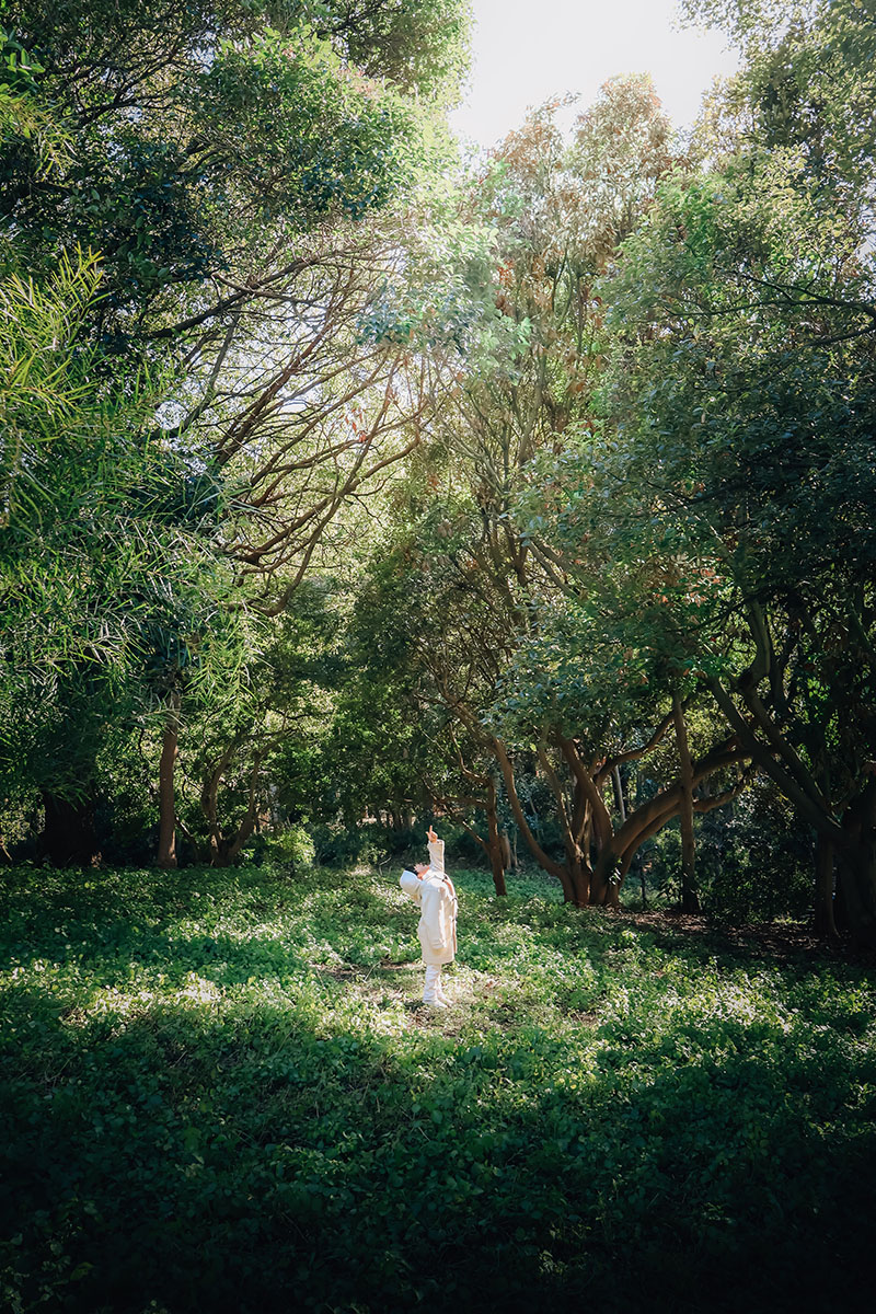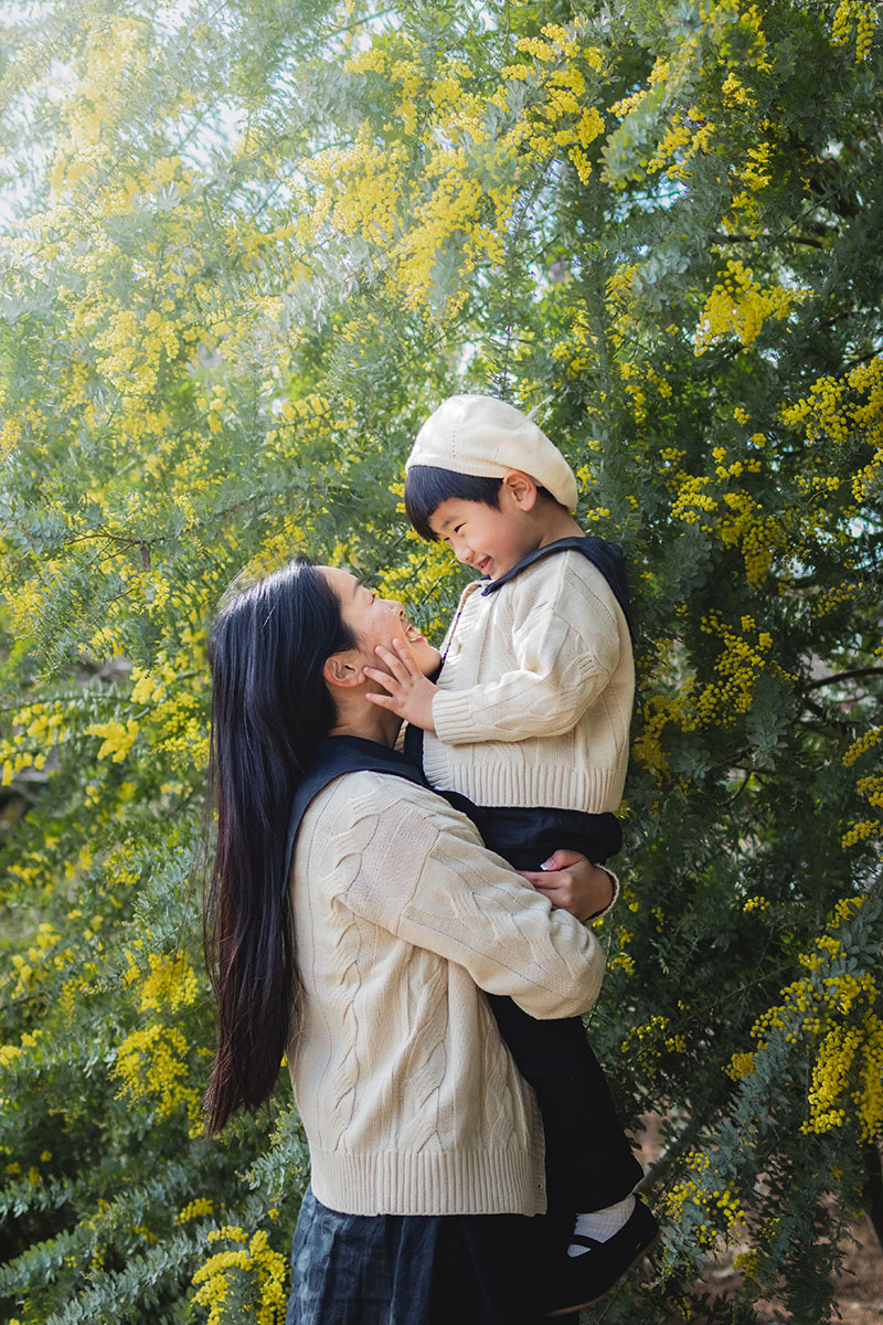 千葉にミモザの大きな木を見に行った日に、その日の思い出になるようなセルフィーをと思い、撮影。晴れてはいましたが、太陽が雲に隠れたり、顔を出したりしていたので、逆光で光が差し込んでくるタイミングを狙いました。子どもにステップツールの上に先に立ってもらい、顔にピントを合わせてから、10秒セルフタイマーのシャッターボタンを押して走り、その場で抱っこして撮っています。