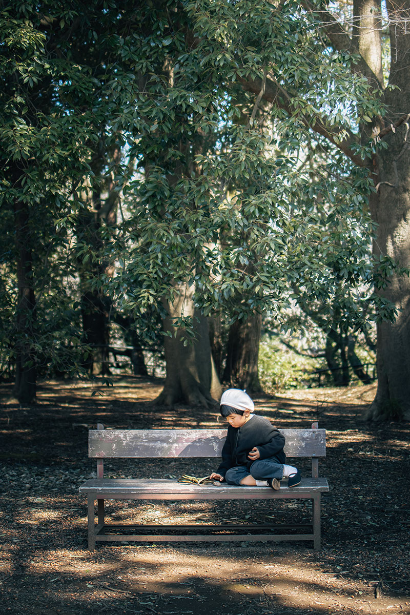 私は明暗差がしっかりある光のシーンが特にお気に入りなので、そういう場所をいつも探すようにしています。子どもを撮影する場合は、光の当たっている場所より、日陰の方が撮りやすいと言われますが、私はいつも明暗差がある場所で、明るい部分に被写体を配置するように意識しています。全体的に暗い中で、光がパッと当たっている場所に子どもを誘導し、存在感を強調すれば、スポットライトが当たっているみたいに、子どもを主役として際立たせることができます。