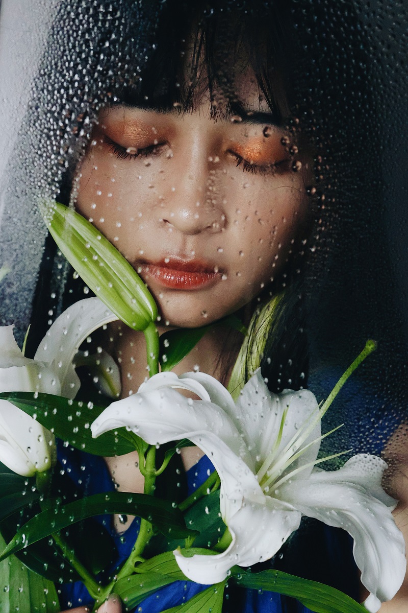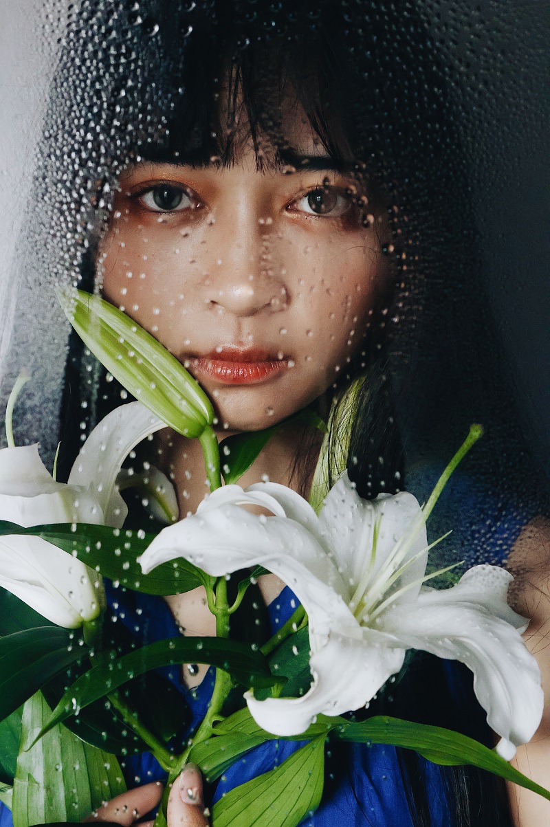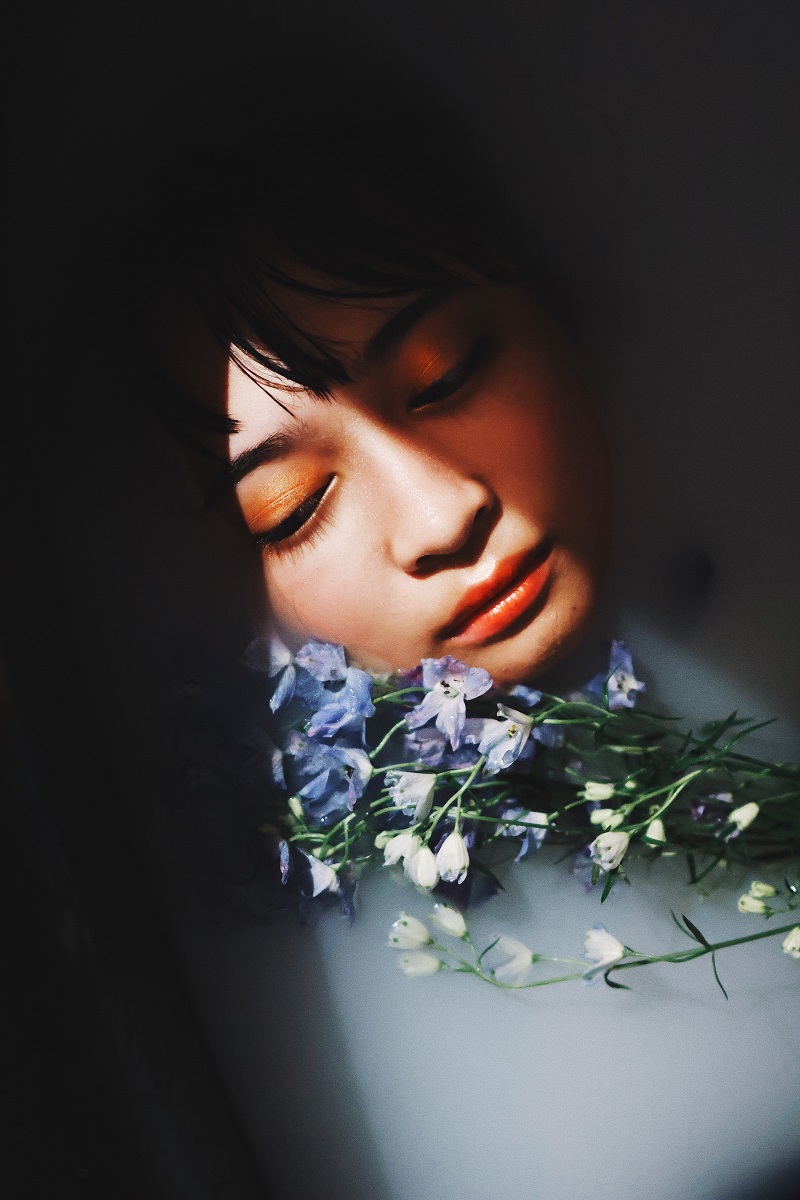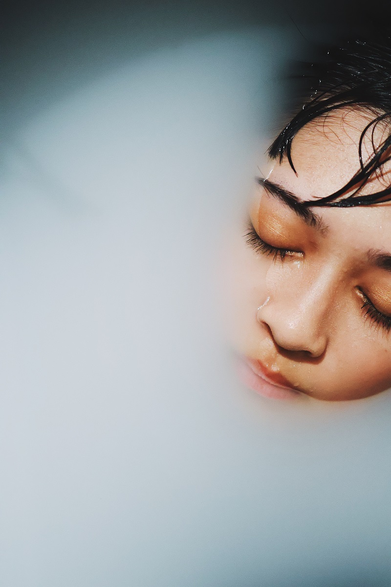 雰囲気のあるポートレート写真を撮るのにおすすめしたいのが、「浴槽」を使った撮影です。水の中が透けにくい、濁り湯系の入浴剤を用いるとより美しい写真が撮れます。白以外にも黒っぽいものや、ラメが入った入浴剤などもあり、それぞれイメージが変わって面白いです。