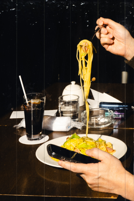 岩田:予測力も大事ですね。これは喫茶店で窓際の席でスマホを見ながらパスタを食べている人がいて、ちょうど全体が暗い中で窓際に光が差し込んでいい雰囲気になっていたので、パスタを上げる瞬間を狙って撮りました。