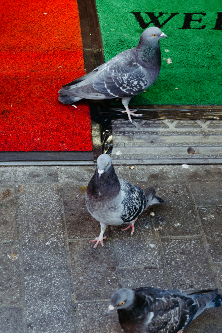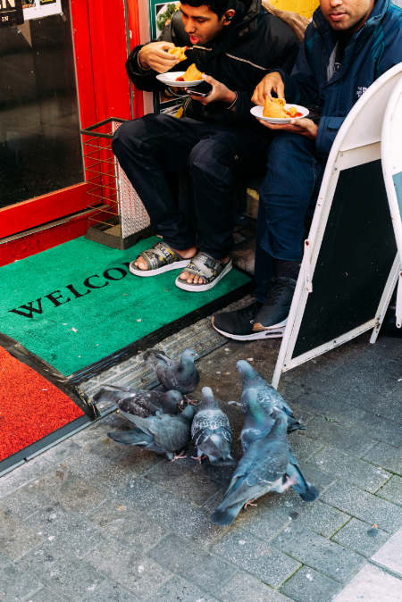 岩田:これはケバブ屋さんの店先に鳩が集まっているところを撮った写真ですがこれも結構アプローチが違いますね。人がいて鳩がいるという関係やストーリーを多分Yumaさんは重視しているのかなと思いました。僕は逆に鳩の方にフォーカスして、鳩とマットの赤と緑の色彩関係が面白いなと思って、ズームも使ってぐっと寄りで撮影しました。