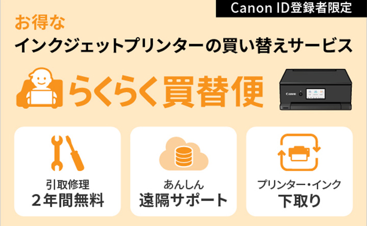 【期間限定】らくらく買替便 ポイント10倍キャンペーン!期間中、Canon ID登録者で、キヤノンオンラインショップにてらくらく買替便対象商品をご購入された方に、通常のキヤノンオンラインショップポイント(商品税込価格の1%)の10倍のポイントを進呈いたします。