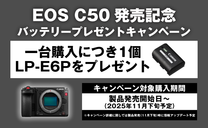 キヤノン EOS C50発売記念 バッテリープレゼントキャンペーン期間中、EOS C50を購入&応募いただいた方に、カメラ1台あたりバッテリーパック LP-E6Pを1個プレゼント!