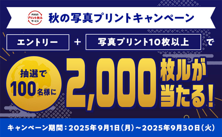 PIXUSプリント枚ルサービス 秋の写真プリントキャンペーンエントリーのうえプリント枚ルサービスに登録したプリンターで写真を10枚以上プリントした方の中から、抽選で100名様に2,000枚ルをプレゼント!