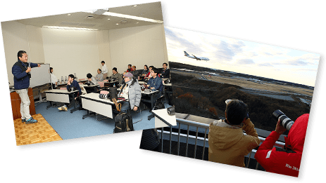 先生のプチセミナーの後、撮影のために建物の屋上へ。轟音をあげて滑走路を離着陸するヒコーキの姿を狙いました。冬の寒さも忘れて迫力満点の写真をとらえました。