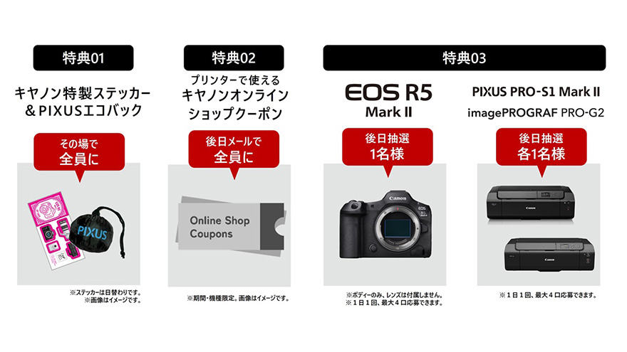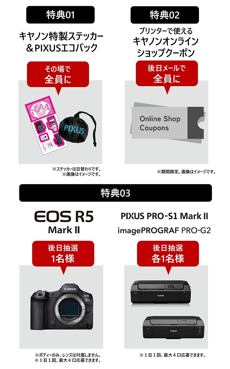 - チェックインいただいた方の中から後日抽選で各1名様にEOS R5 Mark II ボディー、 image PROGRAFPRO-G2 本体 、PIXUS PRO-S1 Mark II 本体 をプレゼントいたします。