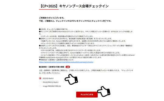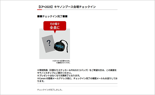 ※応募期間中、CP+2025会場内のキヤノンブース・informationカウンターにてCanon IDログインの上、チェックイン回答をいただくと、以下の特典が受けられます。