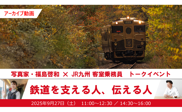写真家・福島啓和 × JR九州 客室乗務員 『鉄道を支える人、伝える人』写真家・福島啓和氏とJR九州客室乗務員・有川麻衣氏をお迎えし、鉄道を“撮る”側の福島氏と“支える”側の有川氏、それぞれの視点で語っていただきました。